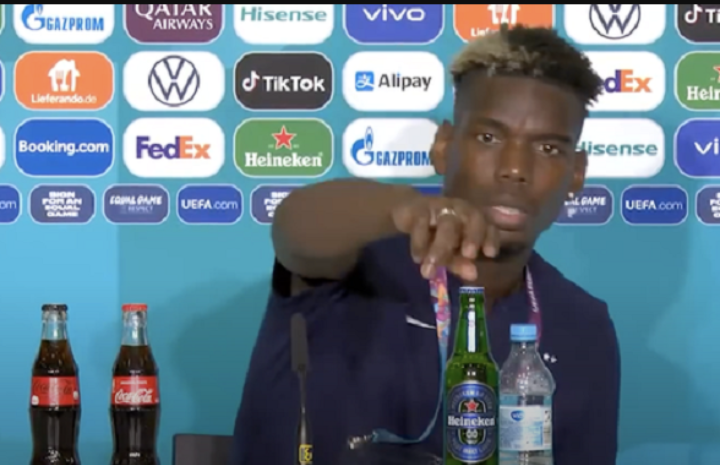 Paul Pogba removes Heineken from his table. Behind him is the logo of the same Heineken and to his right are bottles of Coke that Ronaldo wouldn’t tolerate