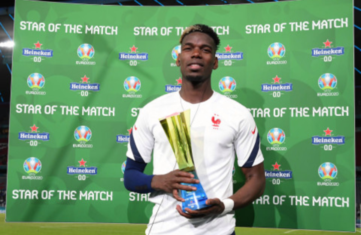 HYPOCRISY: Pogba (standing in front of a banner sponsored and exclusively branded by Heineken) with his STAR OF THE MATCH trophy branded by Heineken