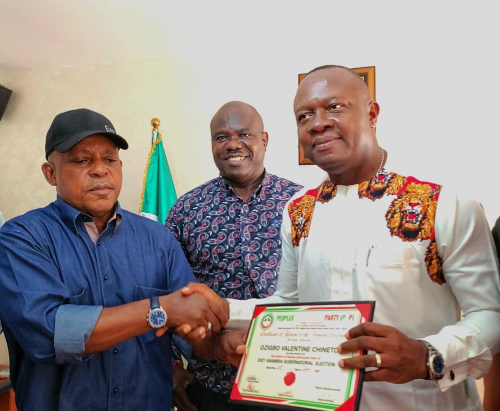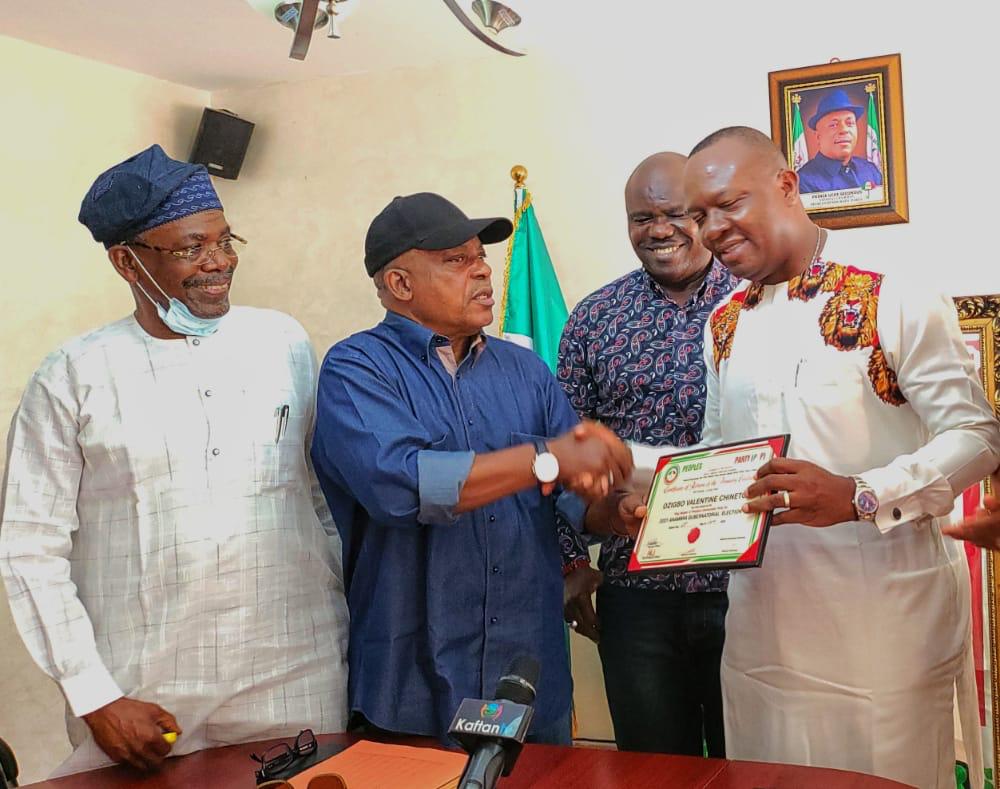 Valentine Ozigbo, the Peoples Democratic Party (PDP) flag-bearer for the 2021 Anambra governorship election, has been presented with his certificate of return after winning the party’s primary election held on Saturday, June 26, 2021.