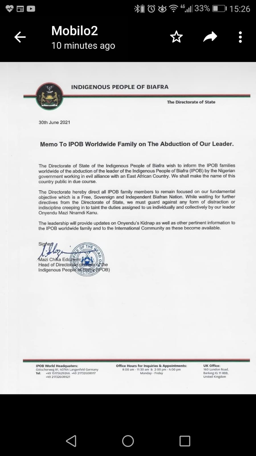 In a release dated 30th June, 2021, obtained by GMTNews, online entitled “Memo To IPOB Family on The Abduction of Our Leader” and signed by one Mazi Chika Emeziem, Head of Directorate of State of the Indigenous People of Biafra IPOB, the group said it “wish to inform IPOB families worldwide of the abduction of the leader of Indigenous People of Biafra (IPOB) by the Nigerian government working in evil alliance with an East African Country.”