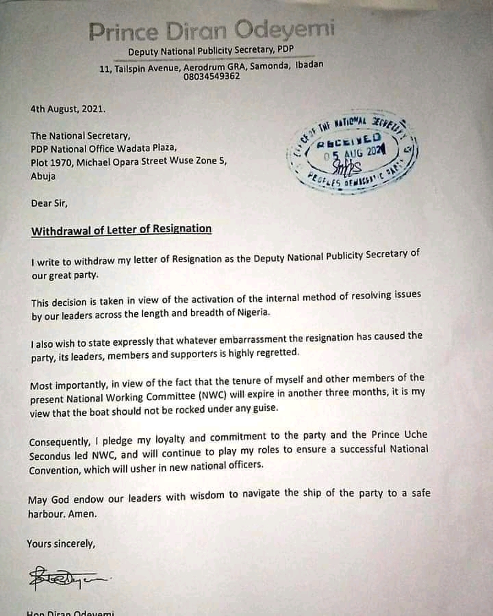 The Deputy National Publicity Secretary of the People’s Democratic Party, PDP, Prince Diran Odeyemi, has withdrawn his letter resigning his position in the National Working Committee, NEC, of the party.