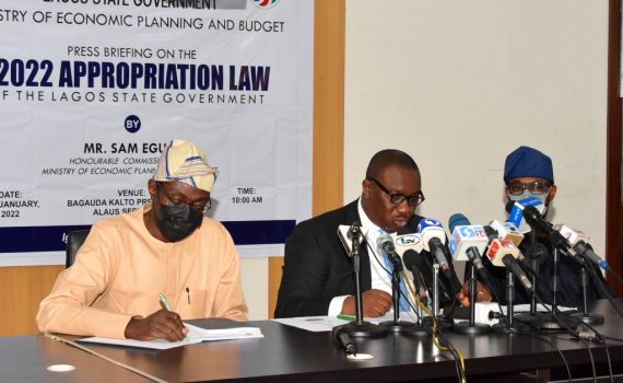 Commissioner for Economic Planning & Budget, Mr. Sam Egube (middle), Commissioner for Energy & Mineral Resources, Mr. Lere Odusote (right) and Commissioner for Transportation, Dr. Federic Oladeinde during a press briefing on the Y2022 Appropriation Law of the Lagos State Government, at the Bagauda Kaltho Press Centre, Alausa, Ikeja, on Friday, January 7 2022