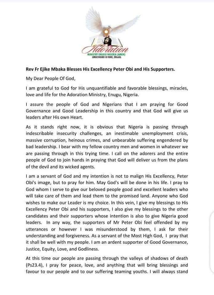 I am a servant of God and my intention is not to malign His Excellency, Peter Obi’s image, but to pray for him. May God’s will be done in his life. I pray to God whom I serve to give our beloved people good and excellent leaders who will take care of them and lead them to the promised land. Anyone who God wishes to make our Leader is my choice. In this vein, I give my blessings to the supporters of His Excellency Peter Obi. In any way they feel offended by my utterances or however I was misunderstood by them, I ask for their understanding and forgiveness. As a servant of the Most High God, I pray that it shall be well with my people. I am an ardent supporter of Good Governance, Justice, Equity, Love and Godliness.