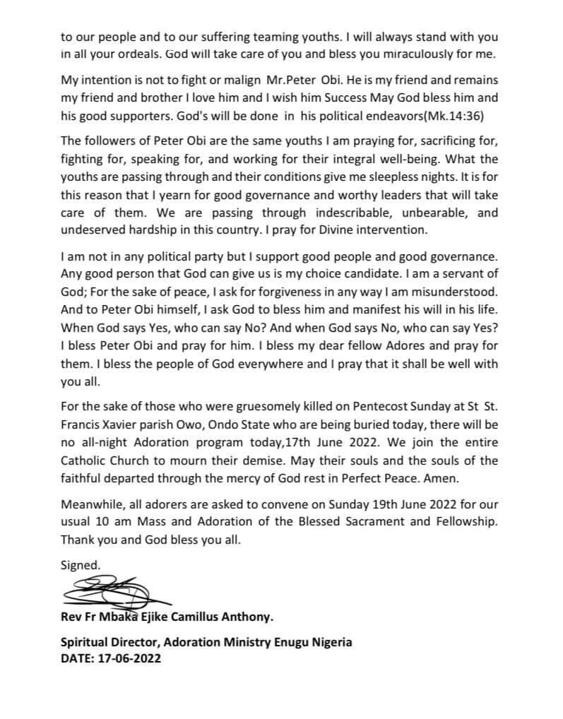 In a statement said to be personally signed by him, Fr. Mbaka said he was quoted out of context, noting that as a servant of God his intention was not to “malign His Excellency, Peter Obi’s image”.