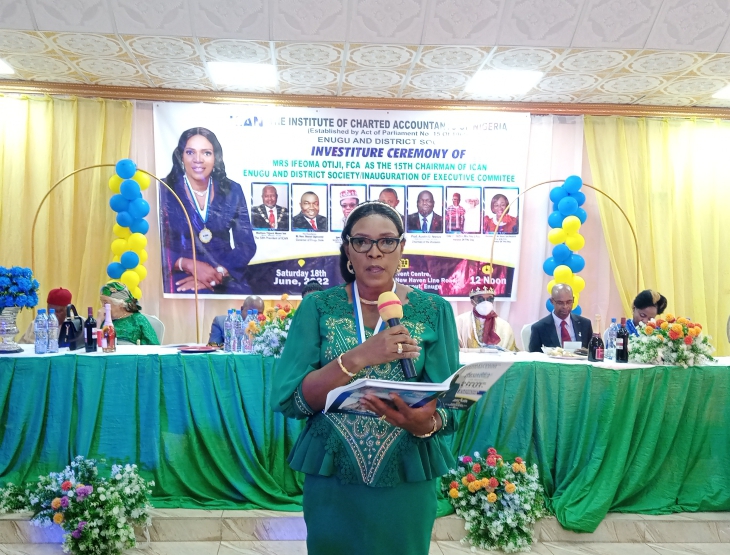 The Institute of Chartered Accountants of Nigeria (ICAN), Enugu District and Society, now has a new chairman, Mrs. Ifeoma Catherine Otiji, fca. She was installed about an hour ago in a ceremony in Enugu.