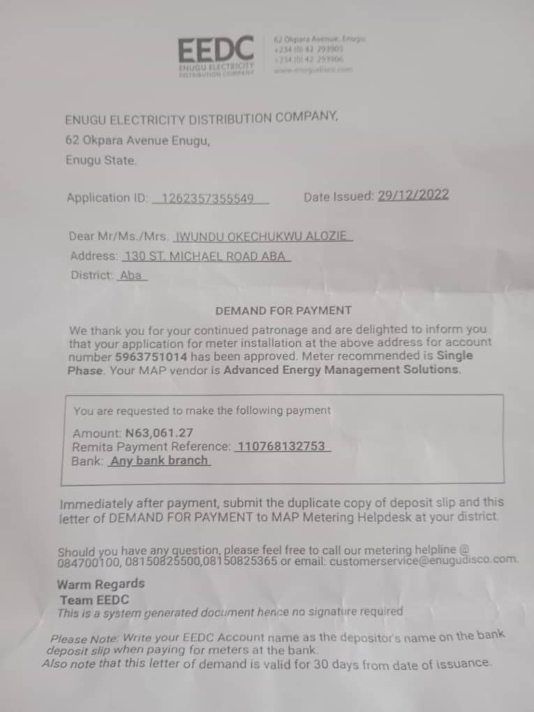 In a fake advisory to a customer at130 St Michael Road in Aba, the Abia State commercial nerve-centre, she is requested to pay N63,061.27 for a single-phase meter into the account of Advanced Energy Management Solutions with any bank whereas Aba Power is working with Holley Metering Ltd, as approved by NERC, for prepaid meter installation in the nine LGAs. She is also given a false Remitta payment reference number of 110768132753.