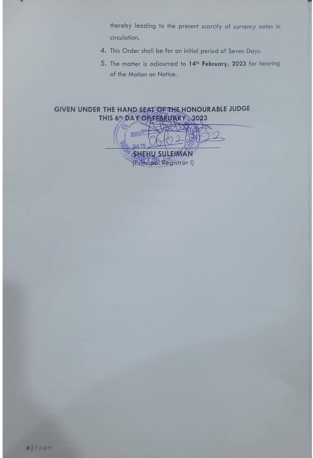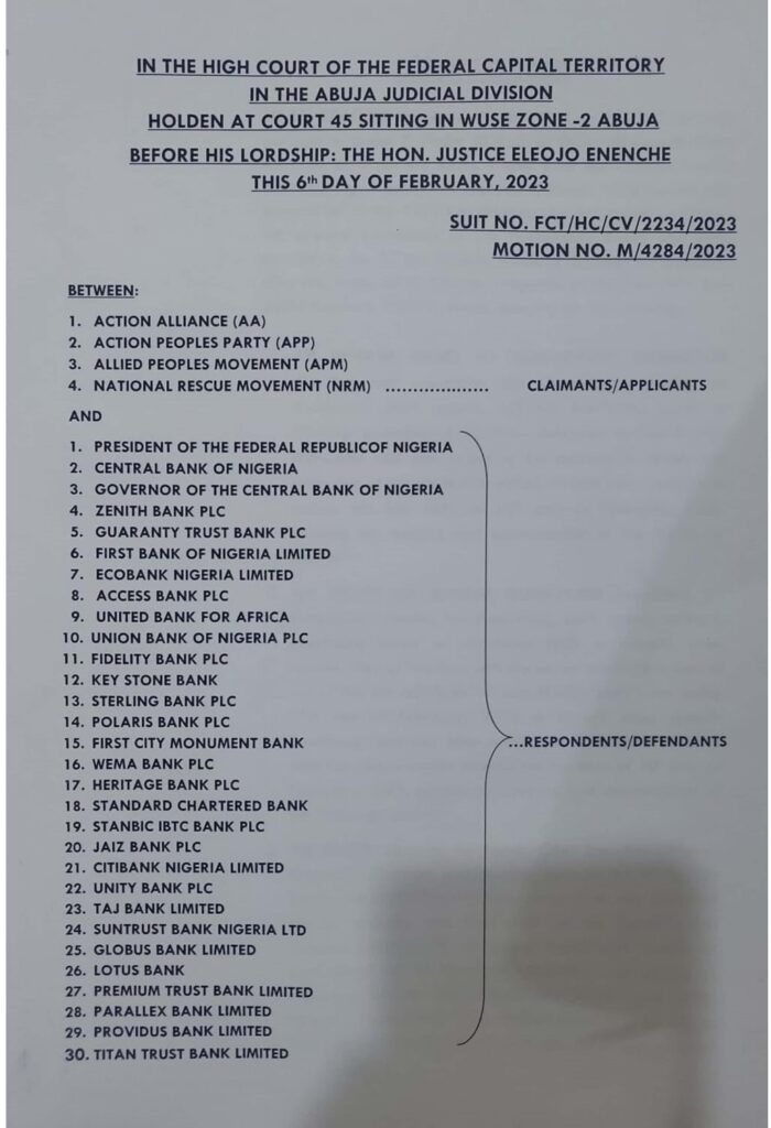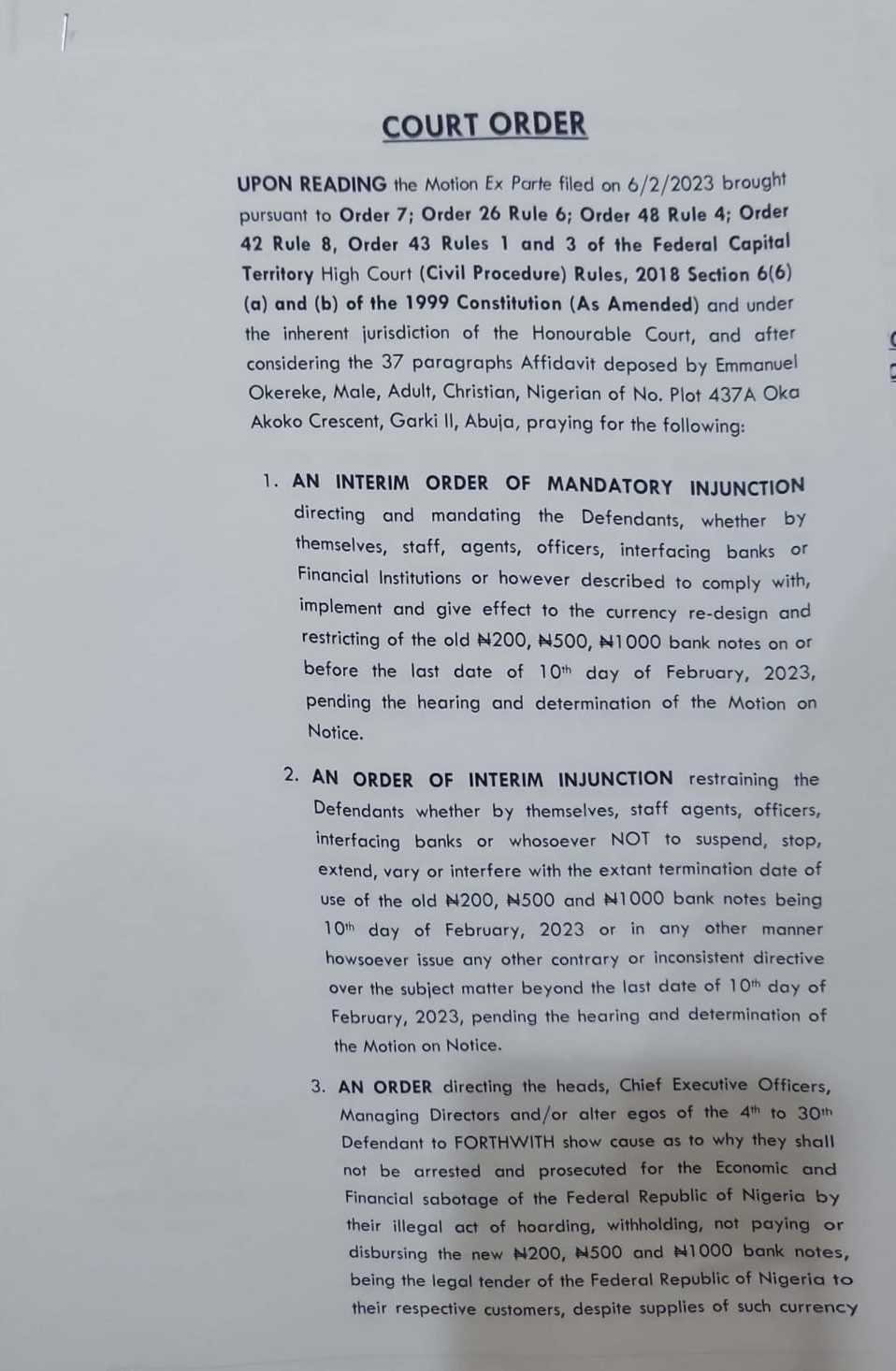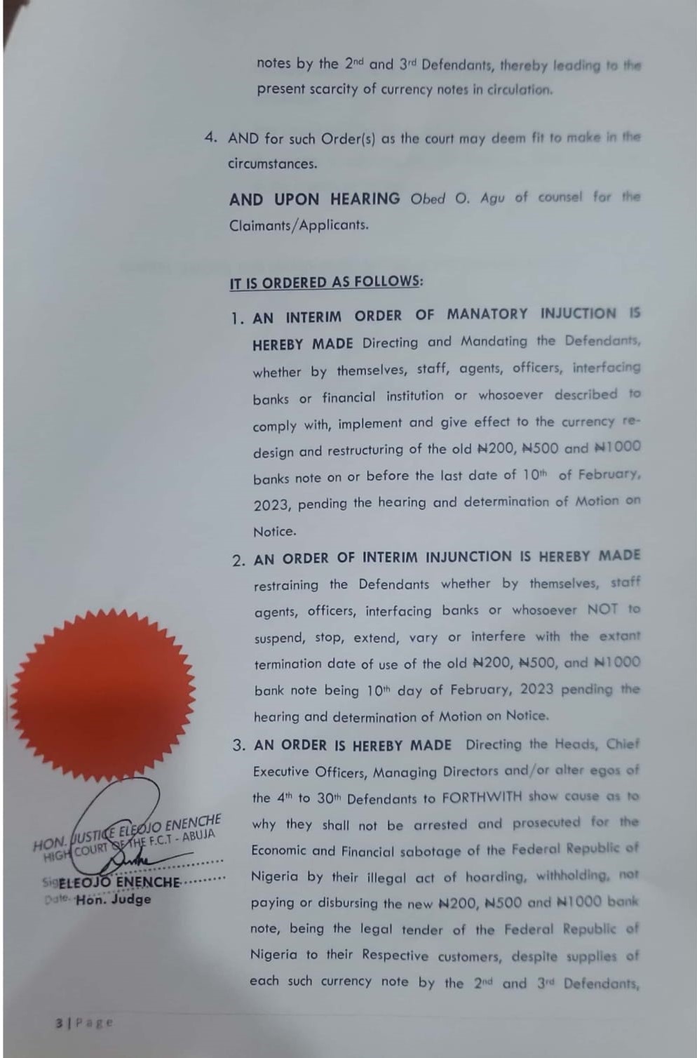 In a motion by five political parties, the court also granted an order directing the Chief Executive Officers (CEOs) of the banks, to show cause why they should not be arrested and prosecuted for the financial sabotage of the country, by illegally hoarding and not disbursing the new N200, N500, and N1000 bank notes, despite supply of such notes by the central bank.