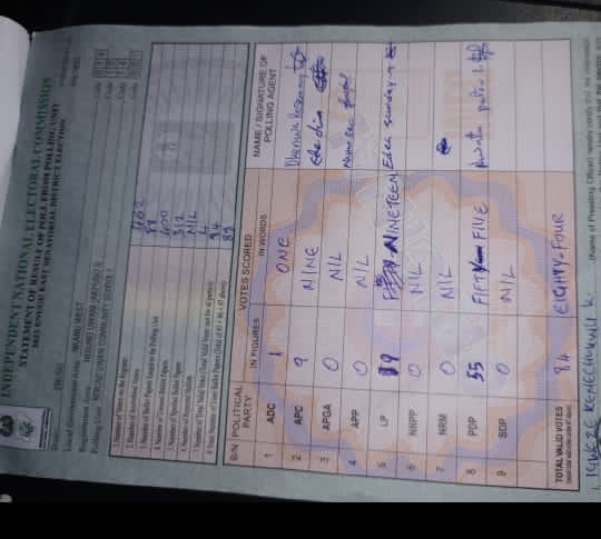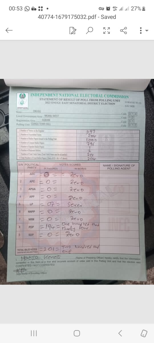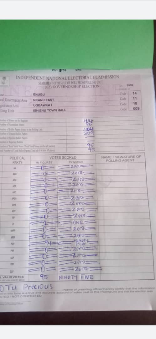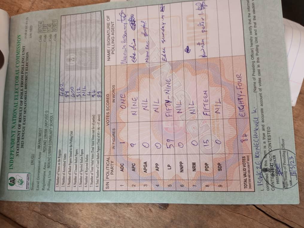 - At the Oji Agu Polling Unit in Agbani in Nkanu West LGA, Senator Nnamani’s hometown, no party agent whatsoever signed the purported Statement of Result of the Polling Unit where I94 votes were awarded to the PDP senatorial candidate. At the Ndiuno Uwani Community School 1 Polling Unit at Akpugo, the original and authentic Statement of Result shows that the LP scored 59 votes and the PDP received 15 votes, but in their mutilated copy which has been uploaded on the iRev portal, with all mutilation showing conspicuously, the LP was allocated just nine votes while the PDP got 55 votes.