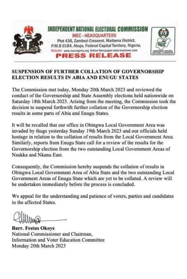 “The Commission met today, Monday, March 20, 2023, and reviewed the conduct of the governorship and State Assembly elections held nationwide on March 18, 2013. Arising from the meeting, the commission took decision to suspend furthwith further collation of the Governorship election results in some parts 9f Abia and Enugu states.