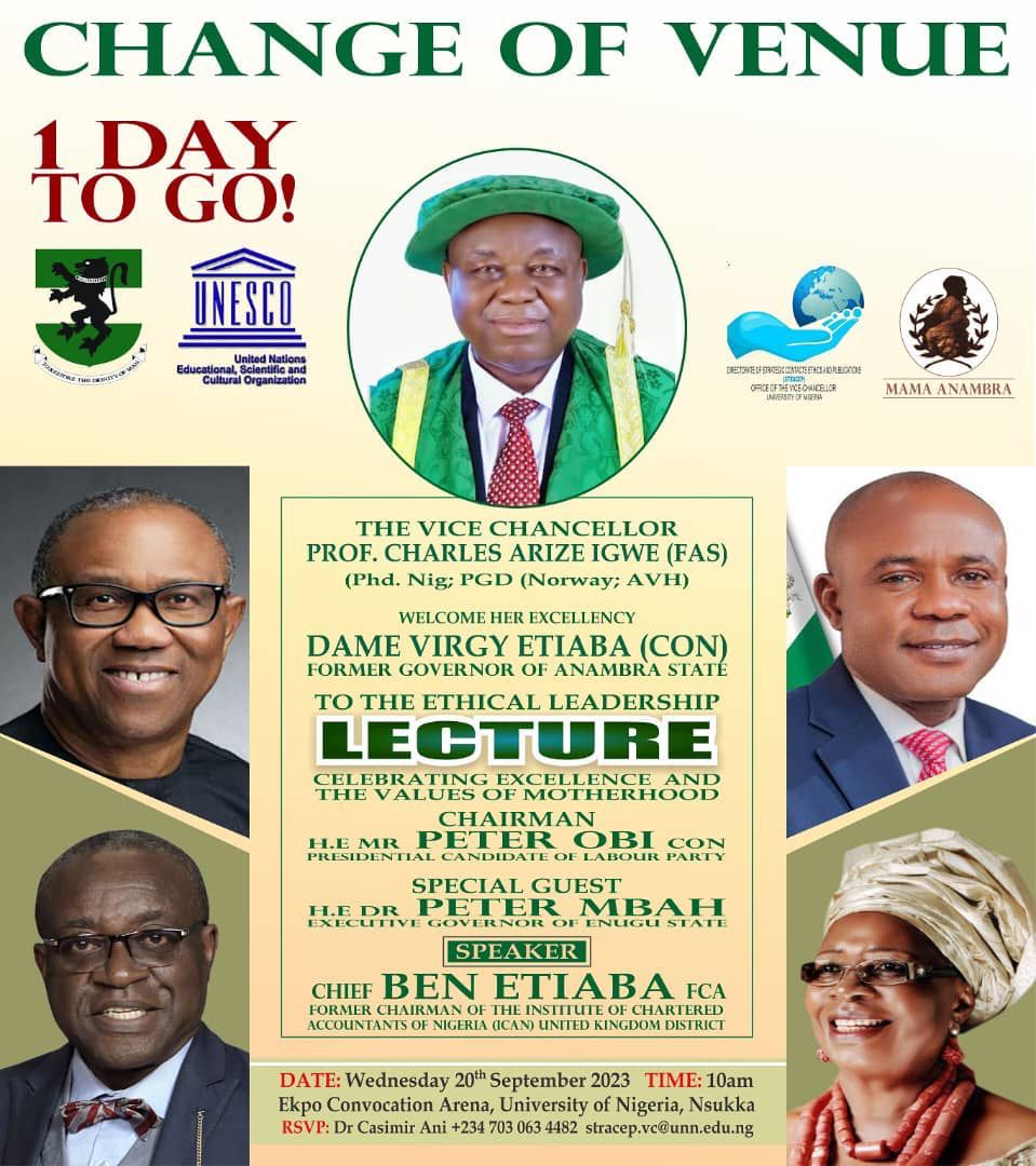 Office Ben Etiaba, fca, is pleased to inform public that there has been a slight change in the venue for this captivating event, the University of Nigeria Nsukka 2023 Ethical Leadership Lecture.