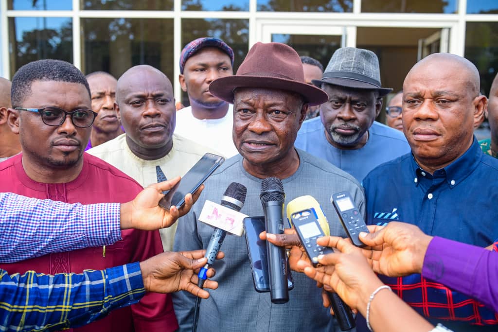 Chairman, Rivers State Joint Public Service Negotiating Council, Comrade Emecheta Chuku (middle); flanked by State Chairman, Nigeria Labour Congress (NLC), Comrade Alex Agwanwor (left); and Commissioner for Information and Communications, Hon Joseph Johnson (right); during a press briefing shortly after a closed door meeting on the new minimum wage with the Governor at Government House, Port Harcourt on Friday.