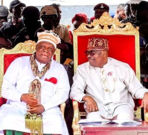 Rivers State Governor, Sir Siminalayi Fubara (right); and the Obong of Calabar, Edidem Ekpo Okon Abasi-Otu V (left); during the official commissioning of the Eze Oha Apara Palace in Rumuigbo, Obio/Akpor Local Government Area, Thursday.