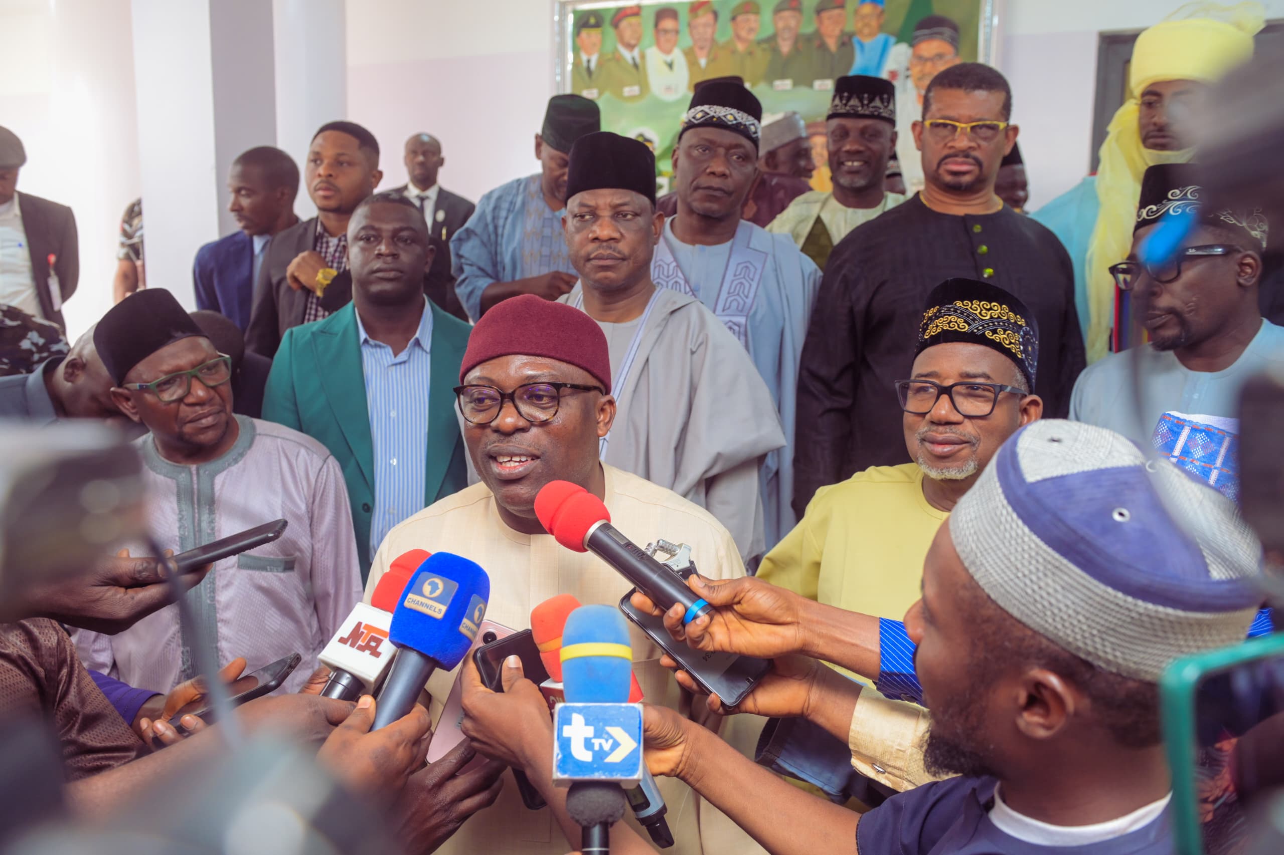 Governor, Siminalayi Fubara (middle); addressing newsmen while his Bauchi State counterpart, Senator Bala Mohammed (right); and others watch in admiration shortly after paying a condolence visit on the Bauchi Governor over the death of his step mother, Hajia Hauwa Mohammed in Bauchi on Saturday.