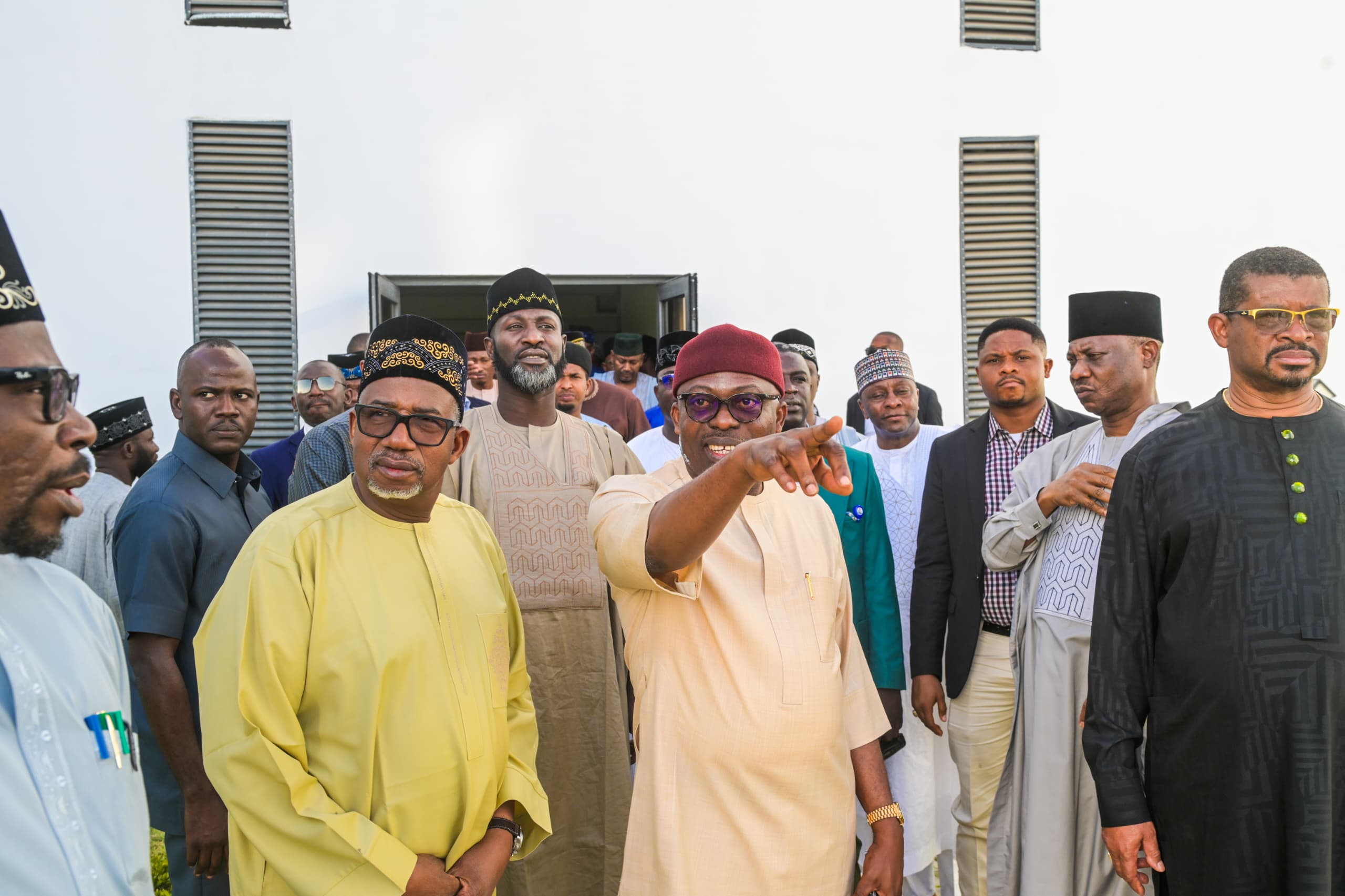 Rivers State Governor, Sir Siminalayi Fubara (middle); pointing at a place of interest while his Bauchi State counterpart, Senator Bala Mohammed (left); and others watch during a condolence visit on his Bauchi counterpart over the death of his step mother, Hajia Hauwa Mohammed in Bauchi on Saturday.