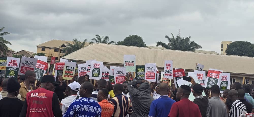 Some Enugu residents protesting the inclusion of convicted and incarcerated Labour Party candidate, Bright Ngene on the ballot