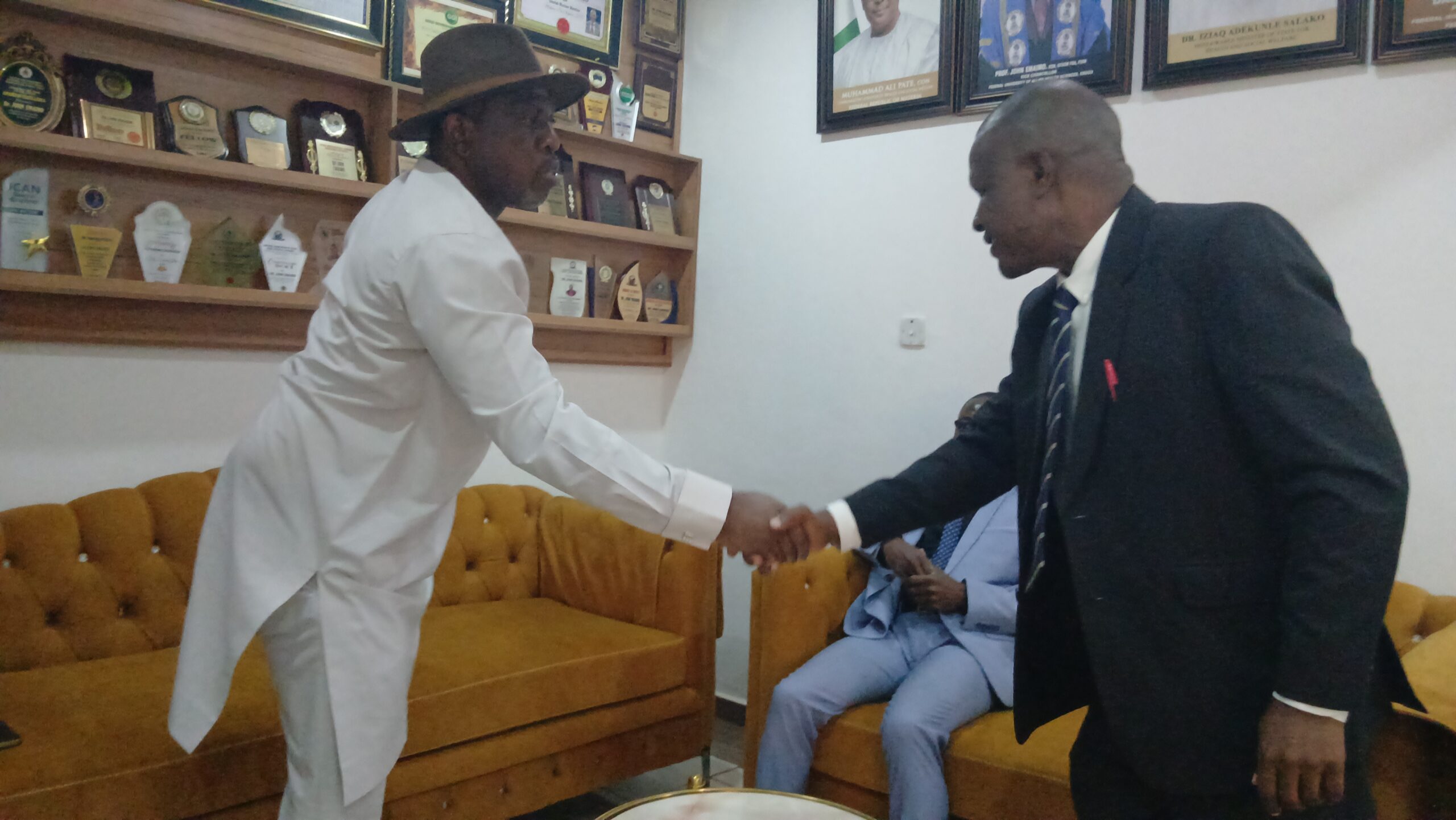 Senator Kelvin Chukwu (L) exchanges a warm handshake with DVC Professor Nwadinigwe, as Vice Chancellor Prof. Emaimo looks on – a symbol of collaboration between government and academia to transform healthcare education in Nigeria. (Photo credit: Kelvin Chukwu’s Media)