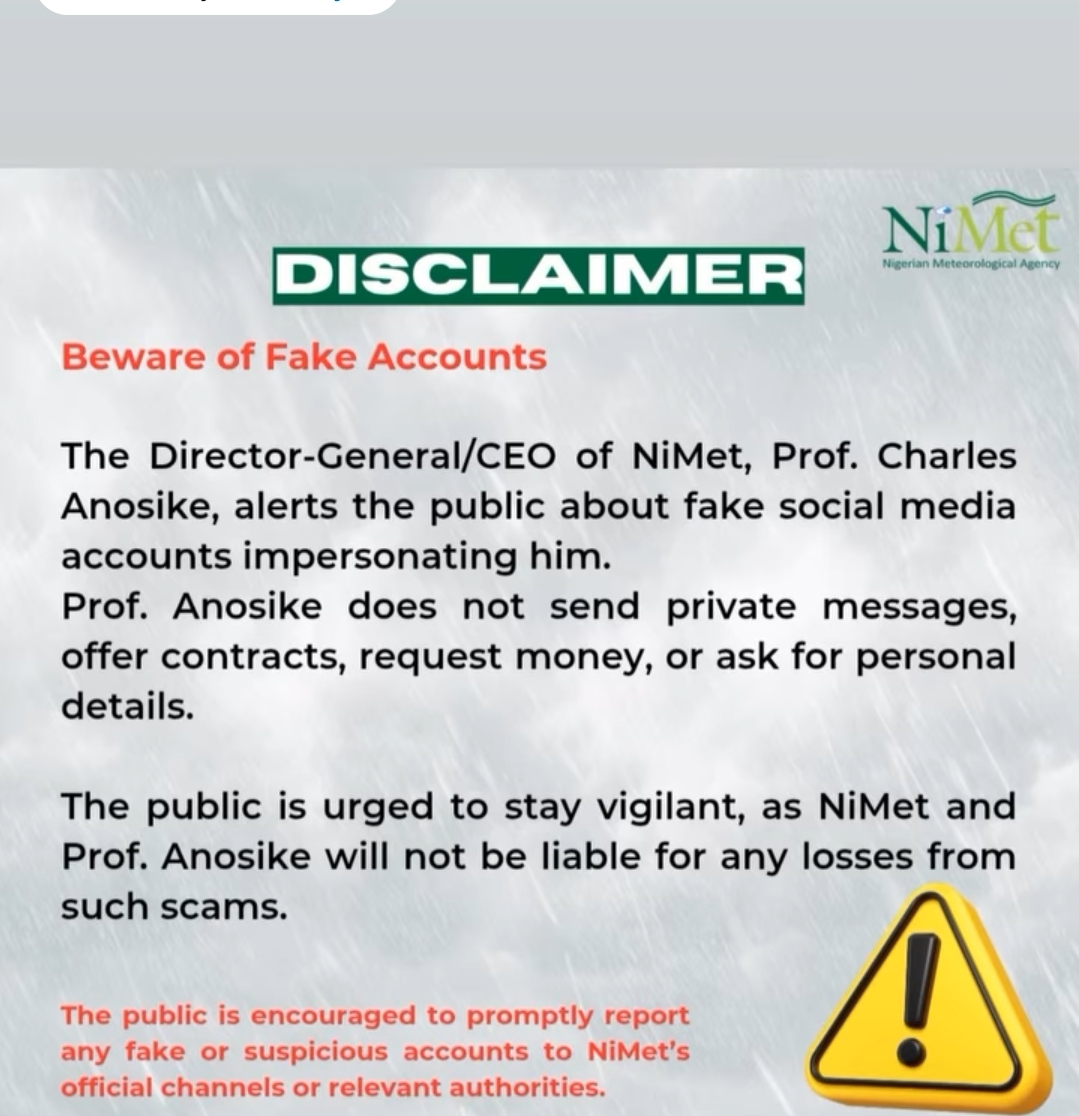 The Director-General/CEO of NiMet, Prof. Charles Anosike, has warned the public about the existence of fake social media accounts impersonating him.