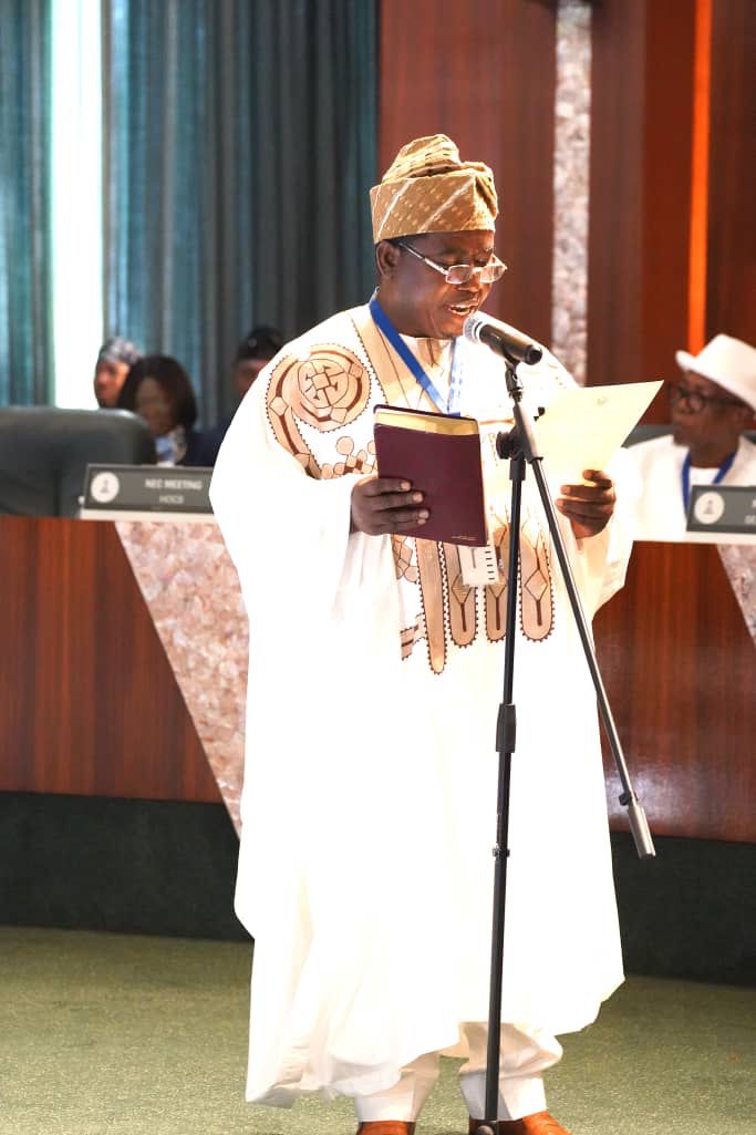 Professor Joash Amupitan takes the oath of office as the Chairman of the Independent National Electoral Commission (INEC), at the Council Chamber, State House, Abuja. Thursday, October 23, 2025