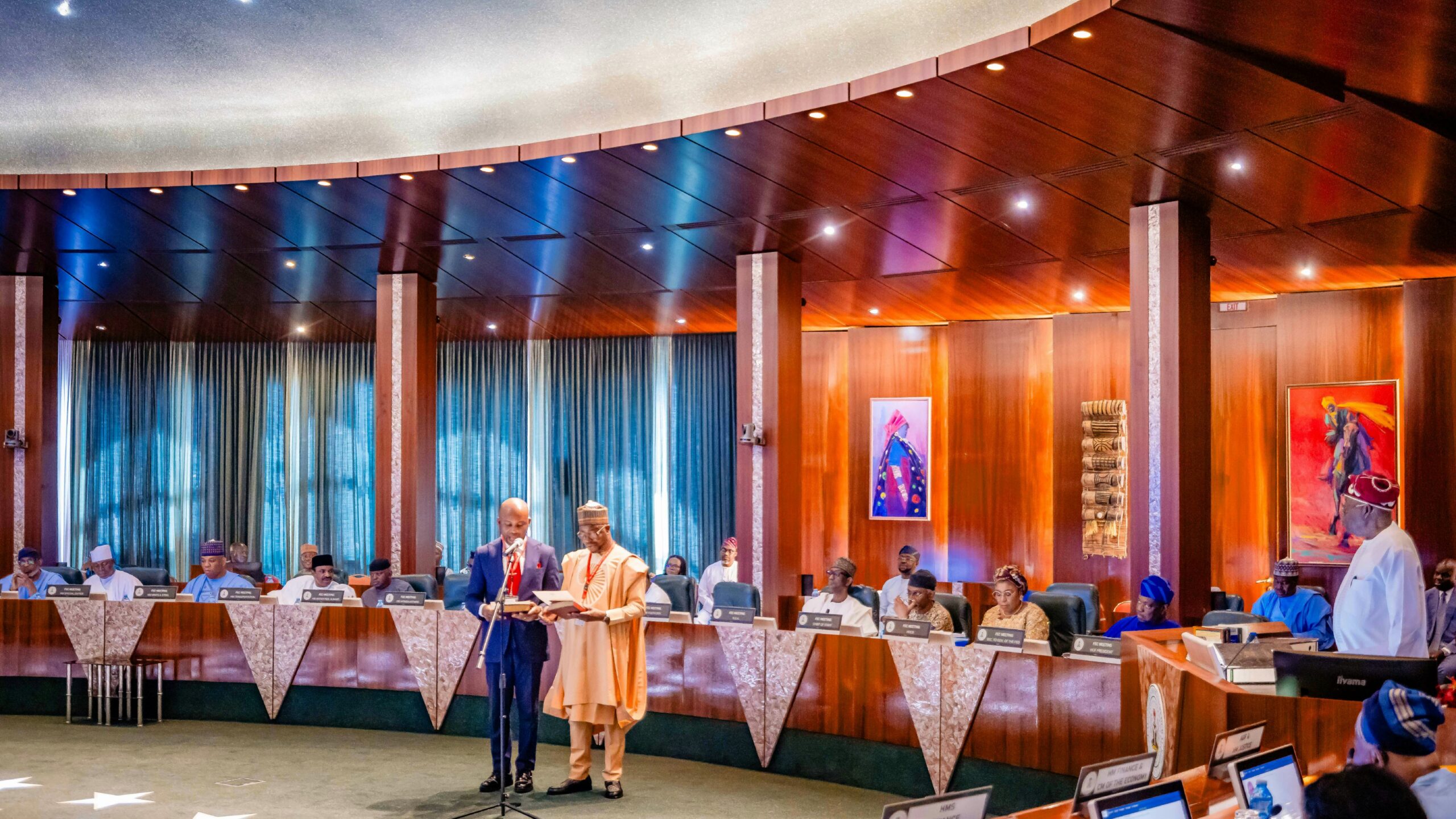 Dr Kingsley Tochukwu Udeh (SAN) and Dr Bernard Mohammed Doro taking the oath of office during the Federal Executive Council meeting in the State House, Abuja, Thursday, November 6, 2025